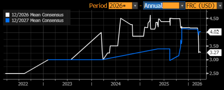 Although sell-side analyst’s estimates are not perfect, Boyd is a well covered name given its dual-listing and decades long prevalence in the market. On a SSSG basis, analysts have a very positive outlook for BYD in the near-term, with estimates calling for 3.27% SSSG in 2026 and 4.02% in 2027. Estimates have largely trended in the positive direction in the past years, marking another good sign for performance.