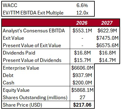 Our multiple valuation model grants us an implied share price of $217.06 USD (~$297.34 CAD) when using a 12.0x EV/TTM EBITDA exit multiple and our calculated 6.6% WACC. This is ~77% above Friday’s close of $122.75 USD ($167.85 CAD).