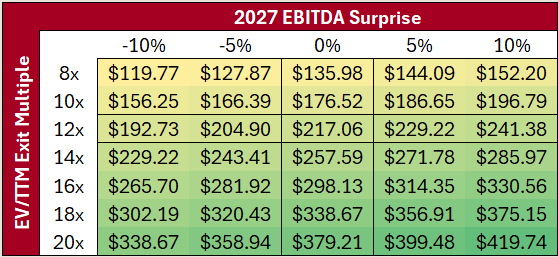 Given that analyst’s estimates are imperfect and that future trading multiples are not certain, we conduct a sensitivity analysis on our results (Figure 13). 2027 EBITDA surprise represents the variance in realized EBITDA as compared to analyst’s current estimates. For an exit multiple, we use 8x as a low end (in-line with current levels, historical low) and 20x as a high end (around the 75th percentile of 10-year trading values). For more context on BYD’s historical trading multiples, see Figure 9.