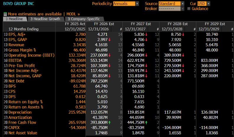 Altogether, current ADAS trends are not particularly alarming for Boyd given the incremental per claim revenue which has come with the implementation of ADAS systems on vehicles. Although collisions per vehicle are likely to continue declining as the share of vehicles with ADAS grows from ~33% to 100%, this will be offset by the cost of servicing the systems. As per Boyd management, the impact of ADAS will likely have a -2% impact on SSSG in the industry in the medium-term, offset by a ~1% increase from calibration needs and a ~1% increase from vehicle complexity and average claim size. When considering this and the revenue synergies which BYD can consistently deliver on via acquisitions, management and sell-side analyst’s estimates of 3-5% SSSG going forward seem very reasonable.