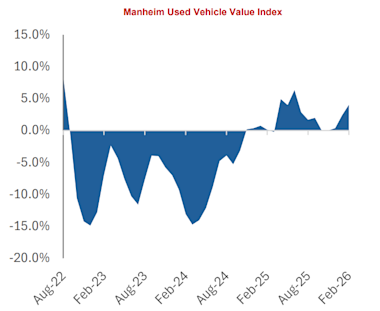 The first was a weakness in used vehicle prices. Post pandemic, new auto supply was extremely low due to weak forecasted supply and supply chain issues like the 2021 and 2022 chip shortage. As supply for new vehicles recovered in 2023 and 2024, used vehicle prices fell significantly. Figure 5 shows the percentage change in the Manheim Used Vehicle Value Index from 2022 to present.