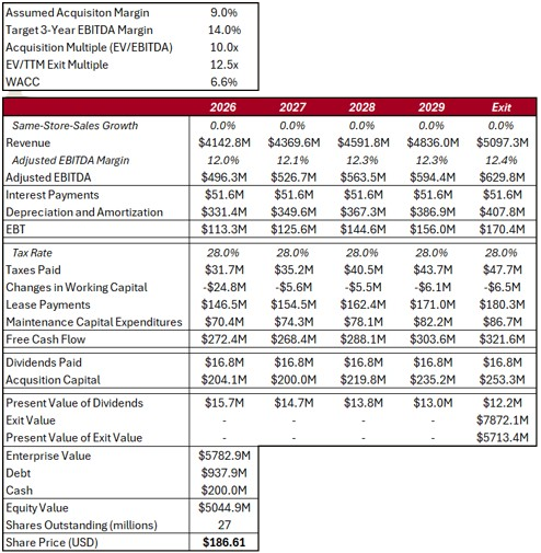 We think that, in part, some of this negative sentiment may stem from BYD’s acquisition of Joe Hudson’s Collision Center in late 2025. This was the largest deal in BYD company history, representing over 250 acquired locations (nearly a 25% growth in BYD locations in a single deal), and coming with a large debt and equity financing to pay the ~$1 billion purchase price. The Joe Hudson’s deal will not be subject to as many synergies as smaller tuck-ins due to the maturity and larger nature of the chain, and this could potentially signal to uninformed investors that overall deal quality is declining. Ultimately, if we assume that BYD is able to execute on realizing deal synergies at or even below their presented expectations, it was a tremendous purchase. Although the exploitable synergies may be lower on a per shop basis, they are still very high, their scale is much larger as compared to tuck-in deals, and in a good dealmaking process the purchase price is reflective of differences in post purchase synergies regardless.