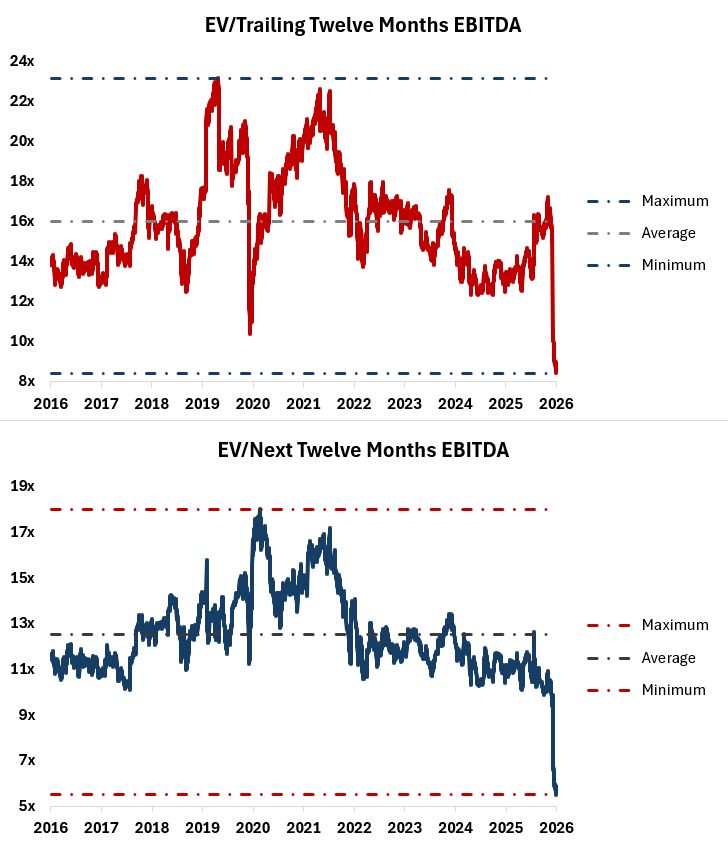 In conjunction with our comprehensive model, we have also constructed a two-year multiple valuation model (Figure 12). This model takes analyst’s consensus EBITDA estimates, applies an EV/TTM EBITDA multiple at exit, and then discounts this to the present for an implied current enterprise value (plus the value of dividends received in the interim).
