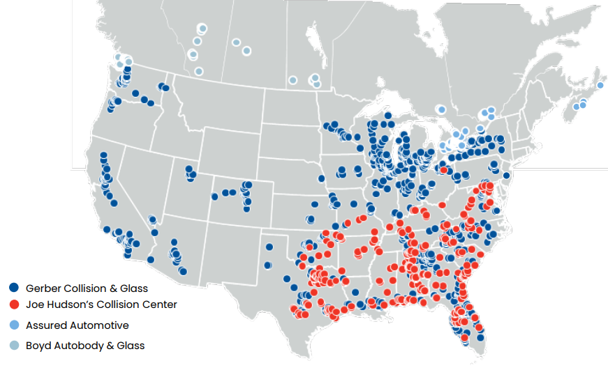 At present, BYD owns over 1,300 collision service shops across North America, with major brands including Gerber Collision & Glass, Joe Hudson’s Collision Center, Assured Automotive, and Boyd Autobody & Glass. Figure 1 shows BYD’s store presence in North America (excluding Gerber locations in Hawai’i).
