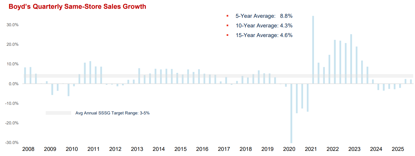 Under normal conditions, Boyd will generally realize SSSG of 3-5% per annum. From late 2023 into 2025, Boyd struggled to produce SSSG above zero for a number of reasons.