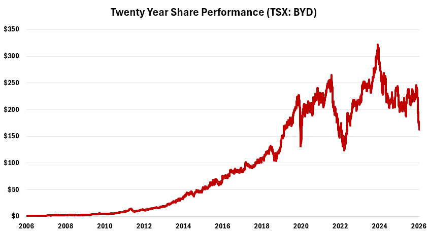In 1990, Boyd Autobody & Glass opened its first location in Winnipeg, Manitoba, quickly growing their presence in the area by opening an additional 11 shops by 1995. In 1997, the firm listed on the TSX under the ticker BYD, trading as an income trust and providing investors with consistent and considerable dividends. Around the turn of the century, the corporation began to utilize cash flows in an alternative way, namely in the pursuit of purchasing other autobody and collision service shops in an accretive fashion. BYD quickly became a staple of the TSX, posting remarkable returns for the following two decades on the back of good-dealmaking and store management.