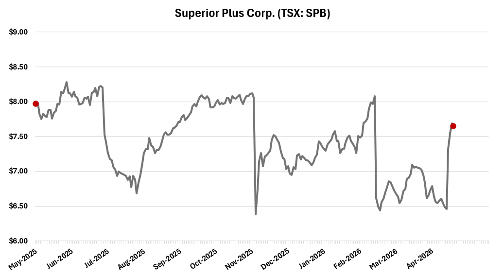 In the past 11 months, what has played out for Superior Plus has been somewhat of a worst case scenario: propane volumes were weaker than expected, CNG volumes were down in response to weak Permian drilling activity, and the Superior Delivers program disappointed both from a 2025 results perspective and in relation to changes in future expectations. At the time that we published, we believed that SPB shares presented very little downside in the event of poor execution. Luckily this expectation was correct, with our realized return coming to -4.0%, or -4.4% on an annualized basis when accounting for the reinvestment of dividends. The below chart shows the performance of SPB shares over our position’s duration including the receipt of dividends, with red markers indicating our position entrance and exit points.